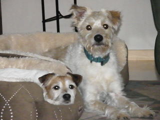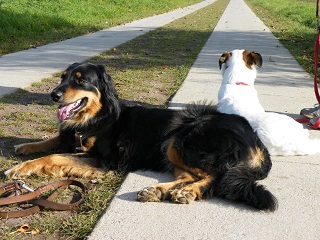 wir heißen Spike (2 Jahre) und Kira (3 Jahre). Bis vor einem dreiviertel Jahr dachten wir noch das Herrchen, Frauchen, das Haus und das Grundstück uns gehören. Der Alltag war für Herrchen und Frauchen mit uns sehr anstrengend, da wir immer aufgeregt waren und alles kontrollieren mussten. Das Spazierengehen mit uns hat vor allem Frauchen keinen Spaß gemacht, da wir sie an der Leine immer hinterher gezerrt haben und Kira jede Hündin und Katze angekläfft hat. Wir wollen hier mal erzählen wie sich das Leben für uns alle vier durch das Hundetraining mit Elke verändert hat.